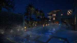 2階インフィニティプールでは、水面に浮かぶオブジェライトと夜空へ伸びるサーチライトが、石垣の空と海をつなぐように輝きます。カラフルでダイナミックな光の演出が、非日常の高揚を演出。